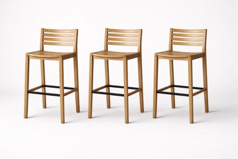 Set di 3 sgabelli in legno con schienale a listelli e poggiapiedi in metallo